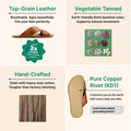 For the sole of our shoes, we use natural buffalo leather, which is renowned for its strength and resilience. This unique choice of material not only ensures long-lasting durability but also promotes a grounding effect. We enhance the conductivity by incorporating a copper rivet at the base, amplifying the flow of electrical energy.