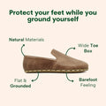 Unlike tight, synthetic shoes that cause crooked feet and bunions, our wide toe box and flat sole provide the space and sensory feedback your feet crave. The result? Healthier feet, better balance, and improved overall wellness!