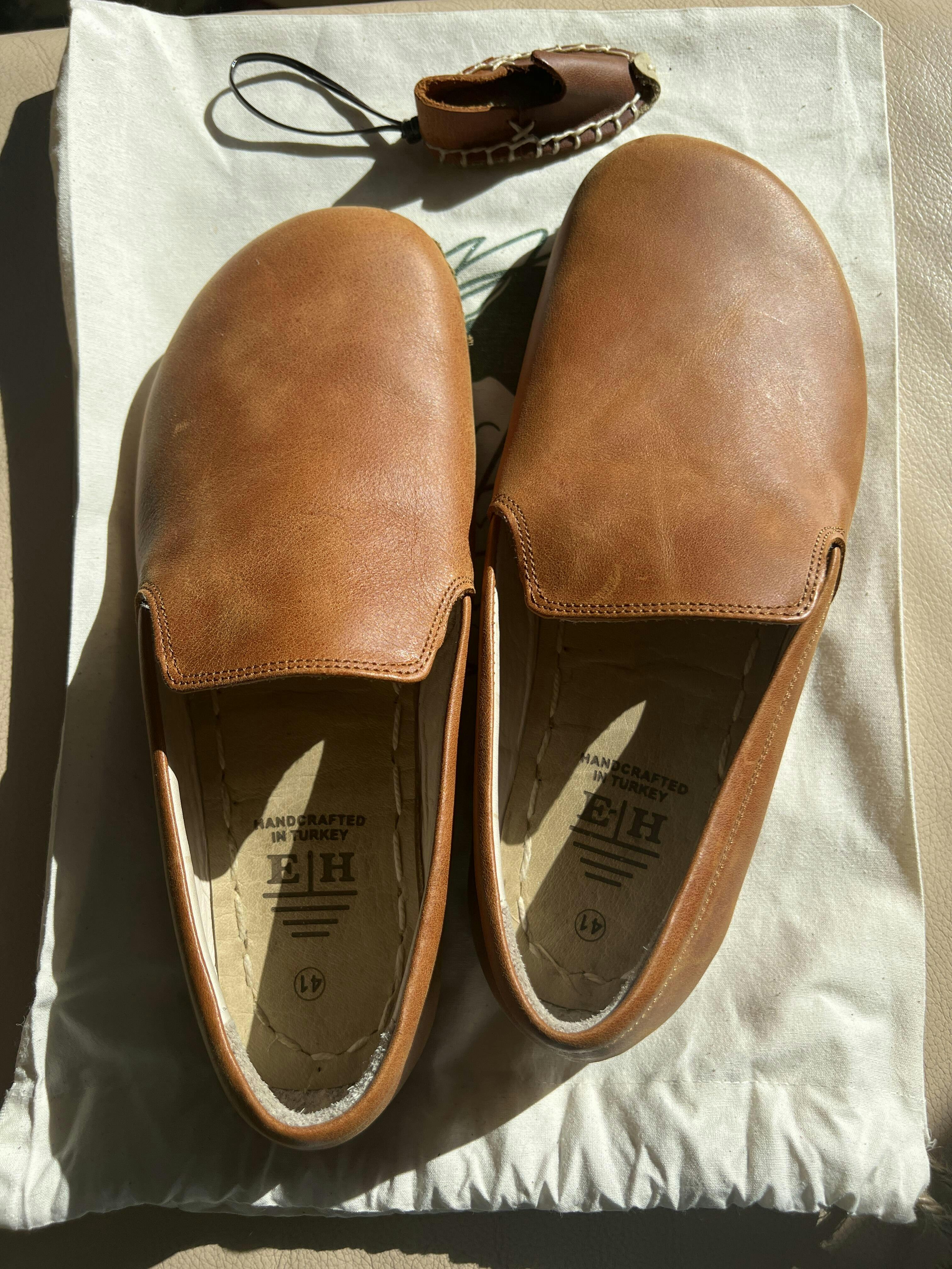 Experience the transformative power of this simple yet profound practice with each purposeful step. Each pair is made-to-order and handcrafted over a span of approximately 3 days. Keep in mind to select a snug fit, as our leather naturally molds to your feet for personalized comfort. Made entirely from natural materials, our shoes allow your feet to breathe freely, eliminating the need for socks!